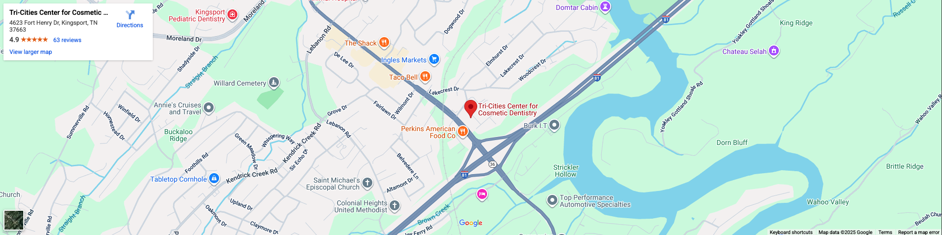 Our dental practice serves patients throughout Kingsport, Johnson City, Bristol, and the broader Northeast Tennessee and Southwest Virginia regions. We’re conveniently located at 4623 Fort Henry Drive, just minutes from the Tri-Cities Airport. Many patients come from nearby areas to get special cosmetic dentistry and full dental care from our Kingsport dentists.